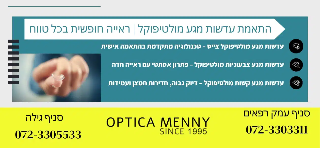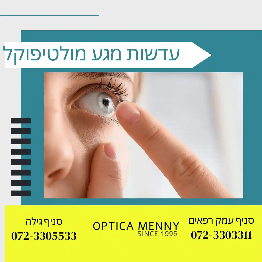 בעוד שמשקפי מולטיפוקל הפכו לפתרון המוכר והנפוץ, רבים מוצאים כי הפתרון הזה מגביל אותם (הם מכבידים על הפנים, מצריכים הרגלי הסתכלות מיוחדים ויוצרים עיוותים בשדה הראייה הצדדי. אם גם לכם מפריע להרכיב את משקפי המולטיפוקל, יתכן שעדשות מגע מולטיפוקל יהוו את הפתרון המוצלח עבורכם. מדובר בפתרון נוח עבור מי שזקוק לשיפור ראייה במספר טווחים (מקרוב, ממרחק בינוני ומרחוק) והכל בעדשה אחת שנעה עם העין, ללא צורך במשקפיים ומבלי לשנות את הרגלי ההסתכלות הטבעיים.